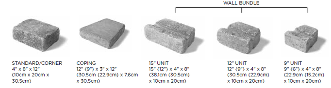 Brussels Dimensional System With its antique weathered appearance Brussels Dimensional System mirrors the appearance of weathered natural stone. BRUSSELS DIMENSIONAL SYSTEM SELECT STANDARDCORNER 4 x 8 x 12 10 x 20 x 305cm TAPERED COPING 12 9 x 3 x 12 305 229 x 76 x 305cm WALL BUNDLE 9 UNIT 9 6 x 4 x 8.